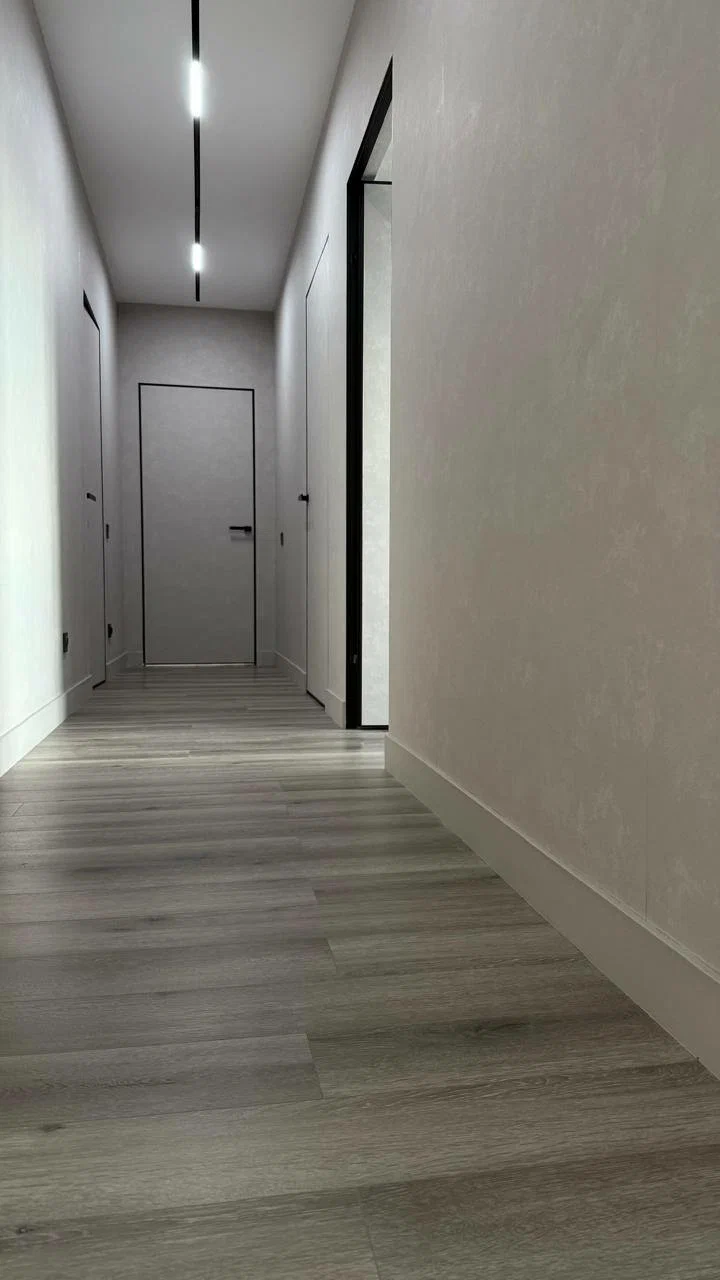 Покрытие уложено практически везде, кроме ванной, санузла и лоджии. Изначально это была трехкомнатная квартира площадью 75 квадратных метров. Мы перепланировали её в полноценную «двушку» с небольшими спальнями и одной большой зоной кухни-гостиной.